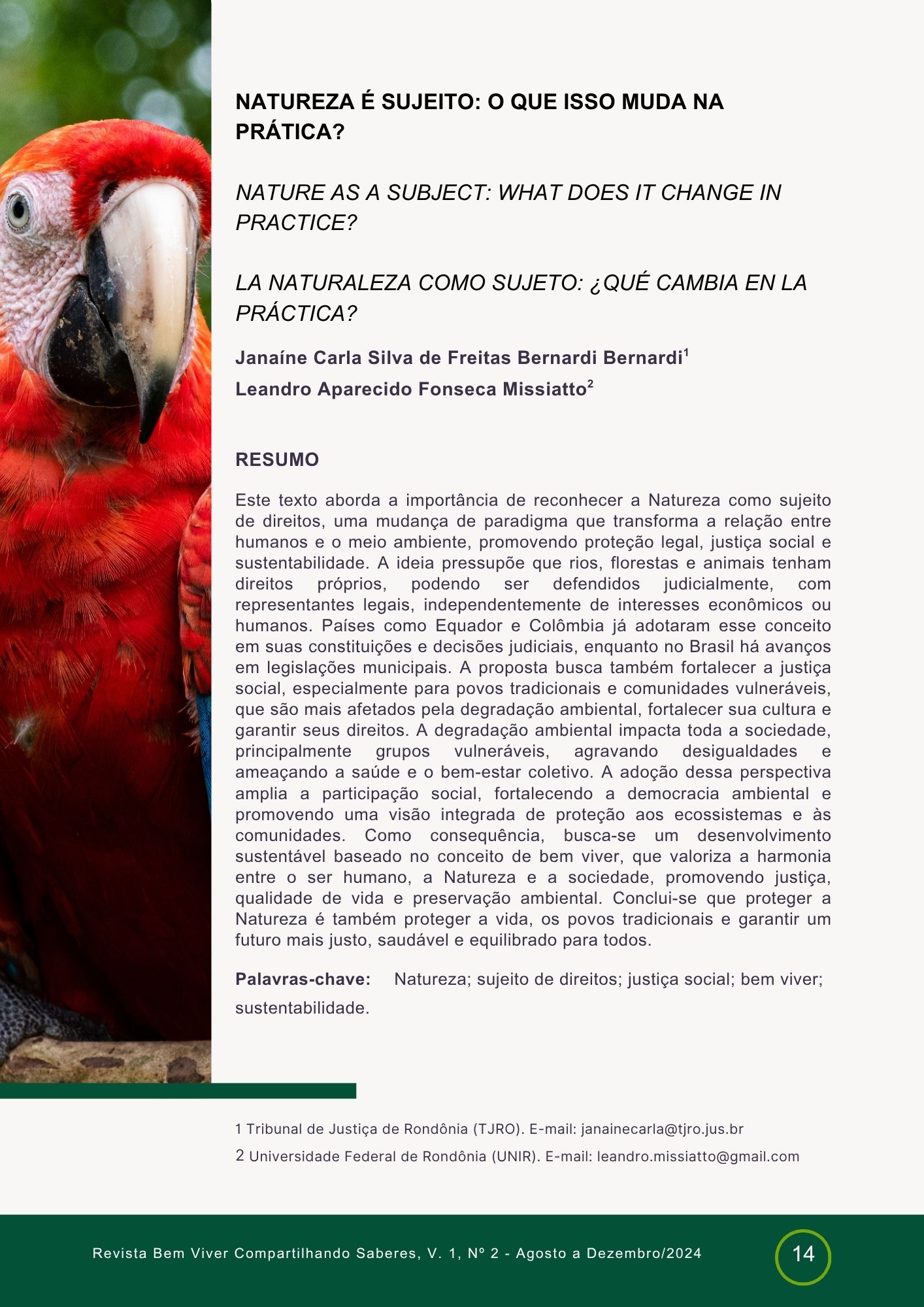 Natureza, sujeito de direitos, justiça social, sustentabilidade, bem viverResumo
